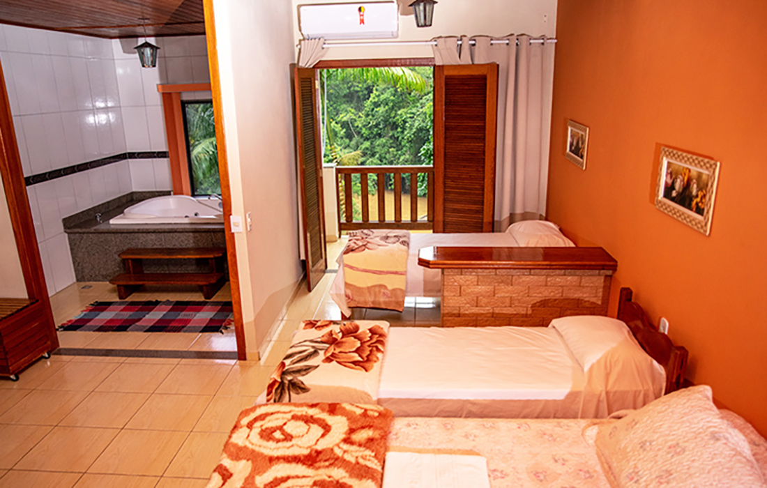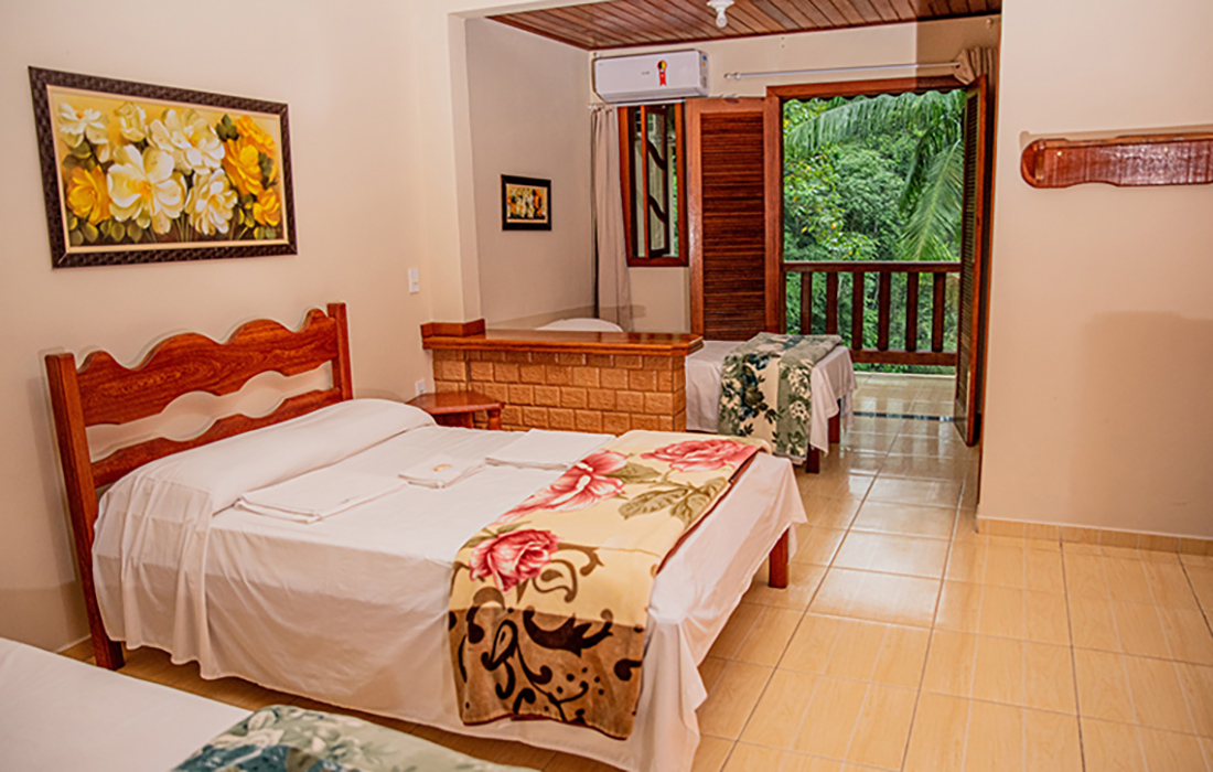 Cama de casal, 02 camas de solteiro, tv, ventilador de teto, ar condicionado, frigobar, secador de cabelo, banheiro privativo, varanda.